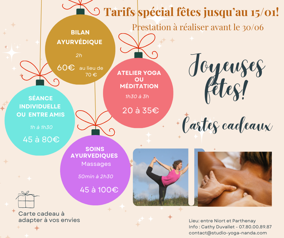 Faire plaisir en offrant un soin ayurvédique, une séance ou un stage/atelier yoga en individuel ou en groupe ou personnalisé, un accès d'1 an à la vidéothèque... pour des fêtes sereines et joyeuses! Profitez des tarifs spécial Fêtes valables jusqu'au 15 janvier, et pour toute prestation réalisée avant le 30 juin!